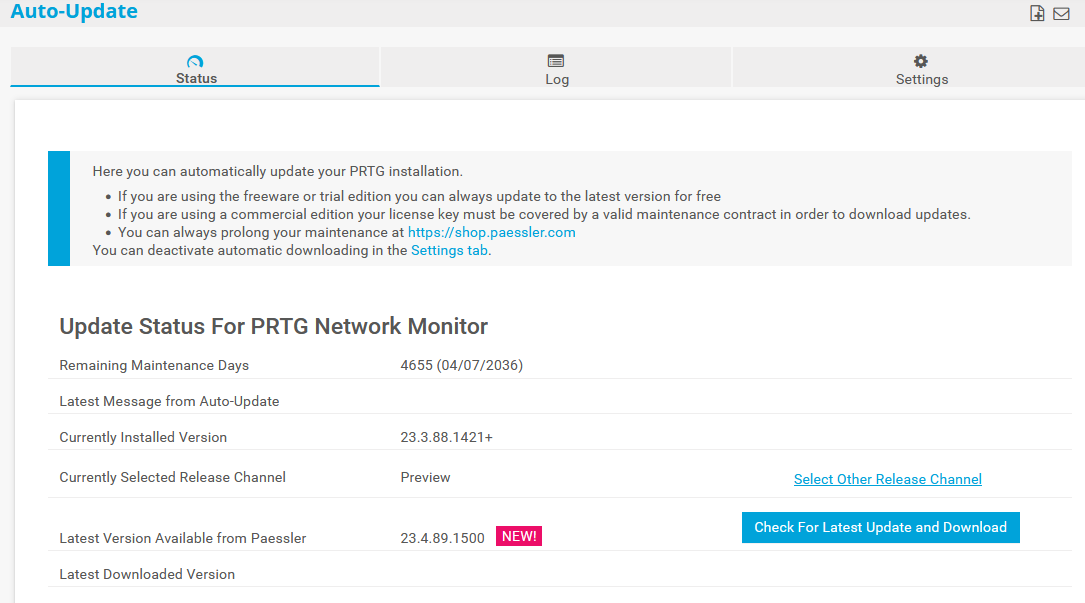 PRTG does not start auto-update downloads if less than 500 MB disk space is available on the PRTG core server system. If this is the case, you can check this on the Log tab.