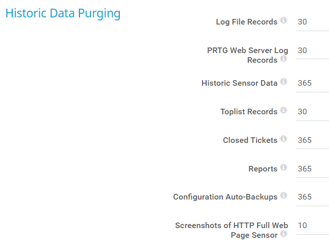 Define for how long PRTG keeps historic sensor data for all sensors. Enter a value in days.