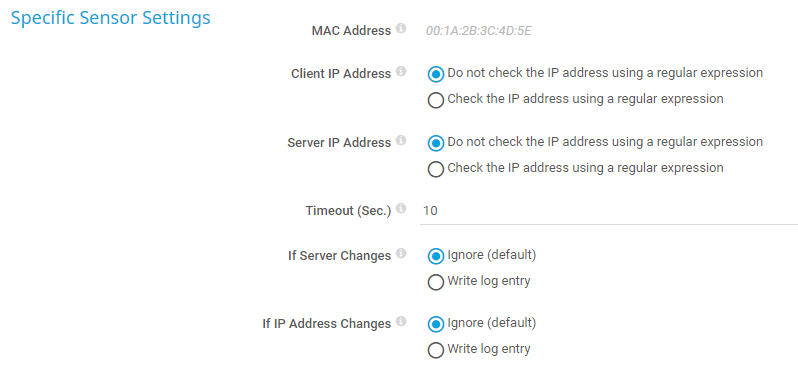 For example, enter 10\.0\.5\..* to make sure that any answering DHCP server returns any client IP address starting with 10.0.5.. If it does not, the sensor shows the Down status. Leave this field empty if you do not want to use it.