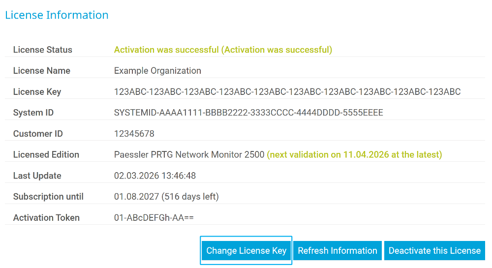 Because PRTG already asks for a license key during installation, you usually do not need to manually enter one afterward. However, there are still scenarios where you need to change your license key and activate the respective license. For example, you must provide the subscription license key of your commercial edition if you upgrade from a freeware edition or trial edition, or if you want to upgrade your subscription license to one with a higher sensor count.