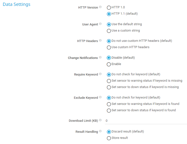 If you enter an absolute URL, the sensor uses this address independently of the IP Address/DNS Name setting of the parent device. You can enter the URL of a web page (to measure the loading time of the page's source code), or enter the URL of an image or of a page asset to measure this element's availability and loading time.