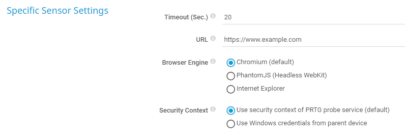 Use security context of PRTG probe service (default): Run the browser engine under the same Windows user account that the probe system runs under. By default, this is the local Windows "system" user account.