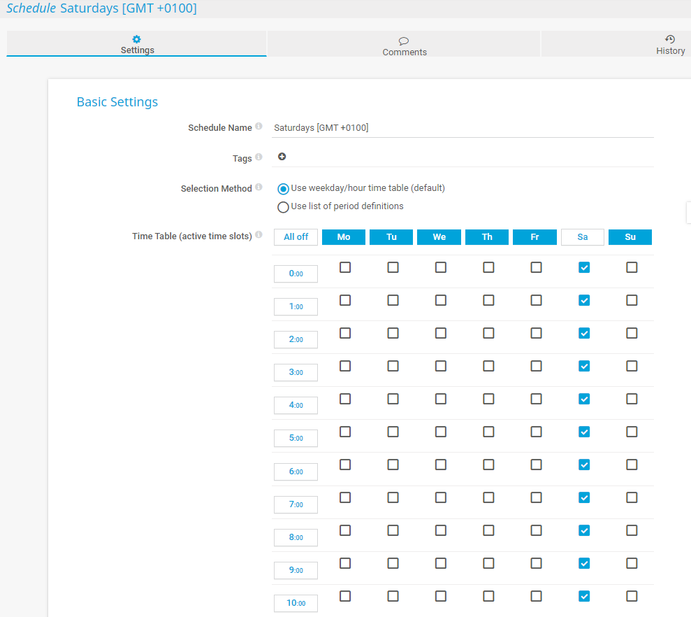 • Use weekday/hour time table (default): Select specific days of the week or specific hours in which the schedule is active. This means that monitoring objects, notifications, and reports are not paused.