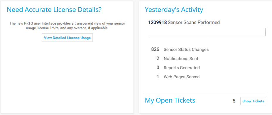 Shows what your PRTG core server or PRTG Hosted Monitor instance did for you on the day before. Hover over the mini graph to show the number of sensor scans on a specific day. See also the Activity History in section System Status. Click Show Tickets under My Open Tickets to display all open tickets that are assigned to you.